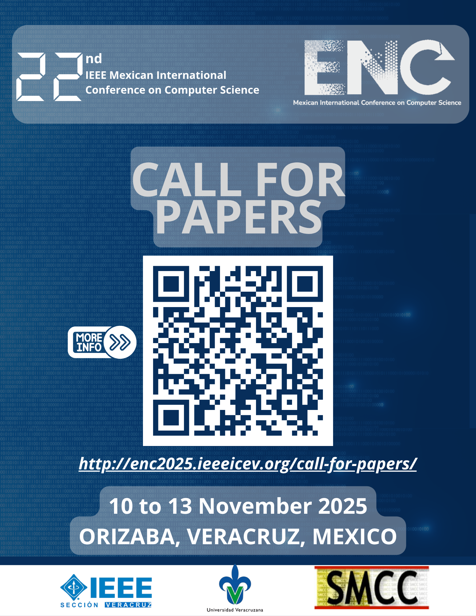Nos complace invitarles a presentar sus contribuciones a la IEEE Mexican International Conference on Computer Science (ENC 2025®), que se llevará a cabo de manera presencial del 10 al 13 de noviembre de 2025, organizada por la Universidad Veracruzana, con el respaldo de la Sección Veracruz de la IEEE y la Sociedad Mexicana de Ciencias de la Computación (SMCC). La sede oficial será el Instituto Tecnológico de Orizaba (TecNM).